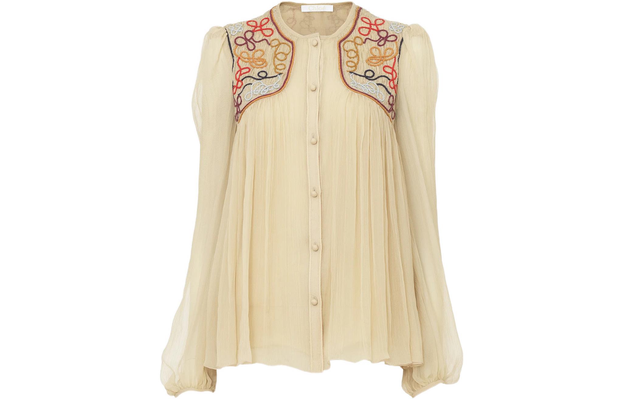 Chloé FW22 褶皱刺绣圆领长袖衬衫 女款 浅褐色