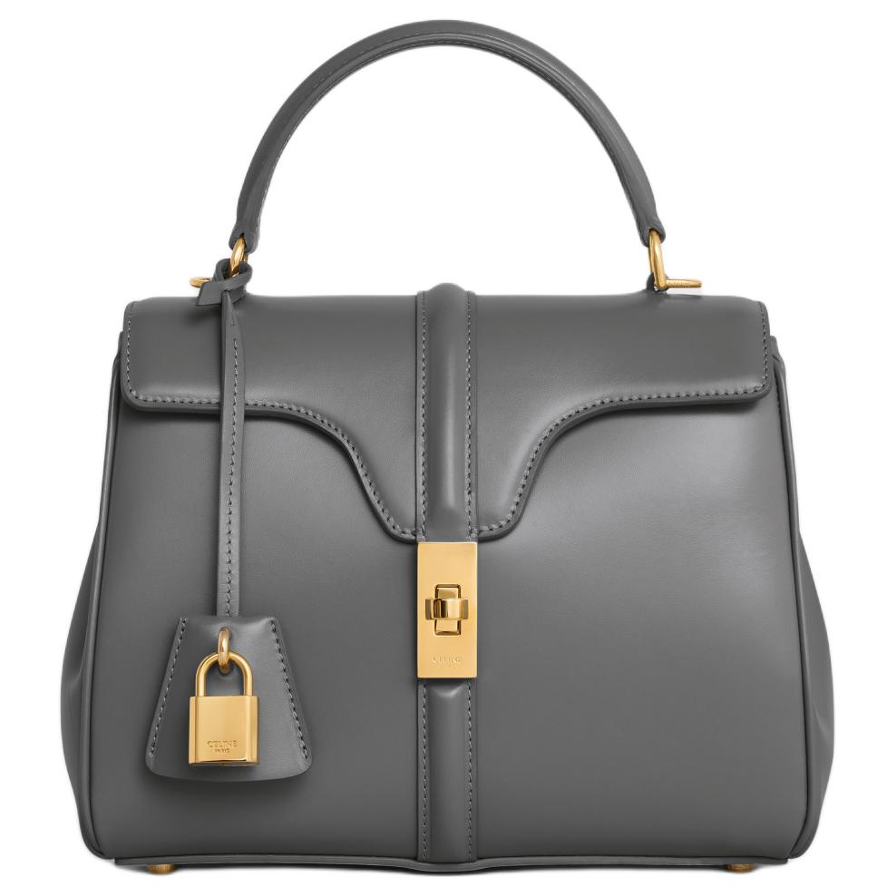 CELINE赛琳 16 金色锁扣可拆卸肩带 缎面小牛皮 单肩斜挎手提包 小号 女款 烟黑色