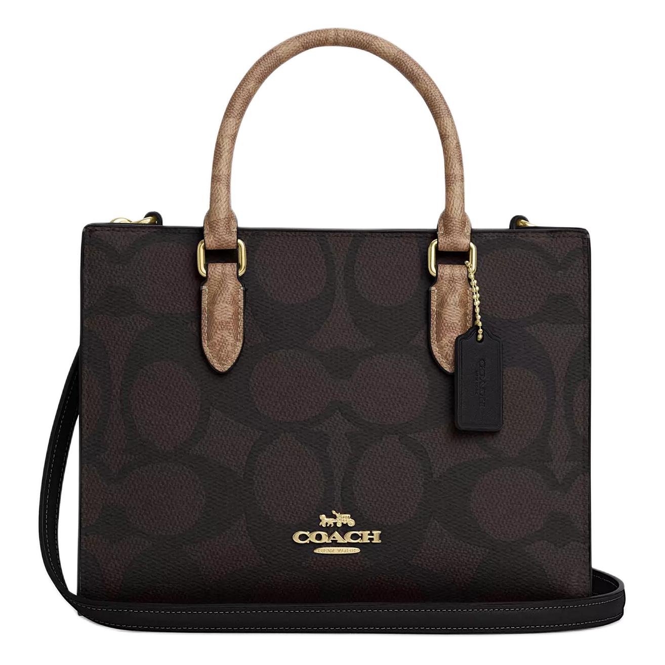 COACH蔻驰 Laurel 31 可拆卸肩带拉链开合 涂层帆布 单肩斜挎手提包 大号 女款 金色拼胡桃木拼黑色