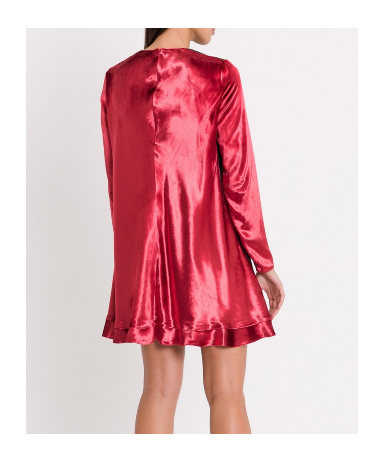 RED VALENTINO SS23 亮面荷叶边圆领套头短款长袖连衣裙 红色