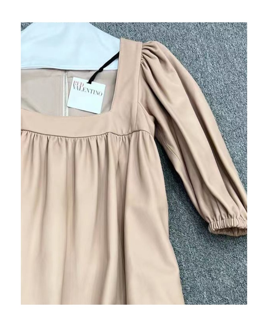 RED VALENTINO 纯色荷叶边皮质短袖连衣裙 卡其色