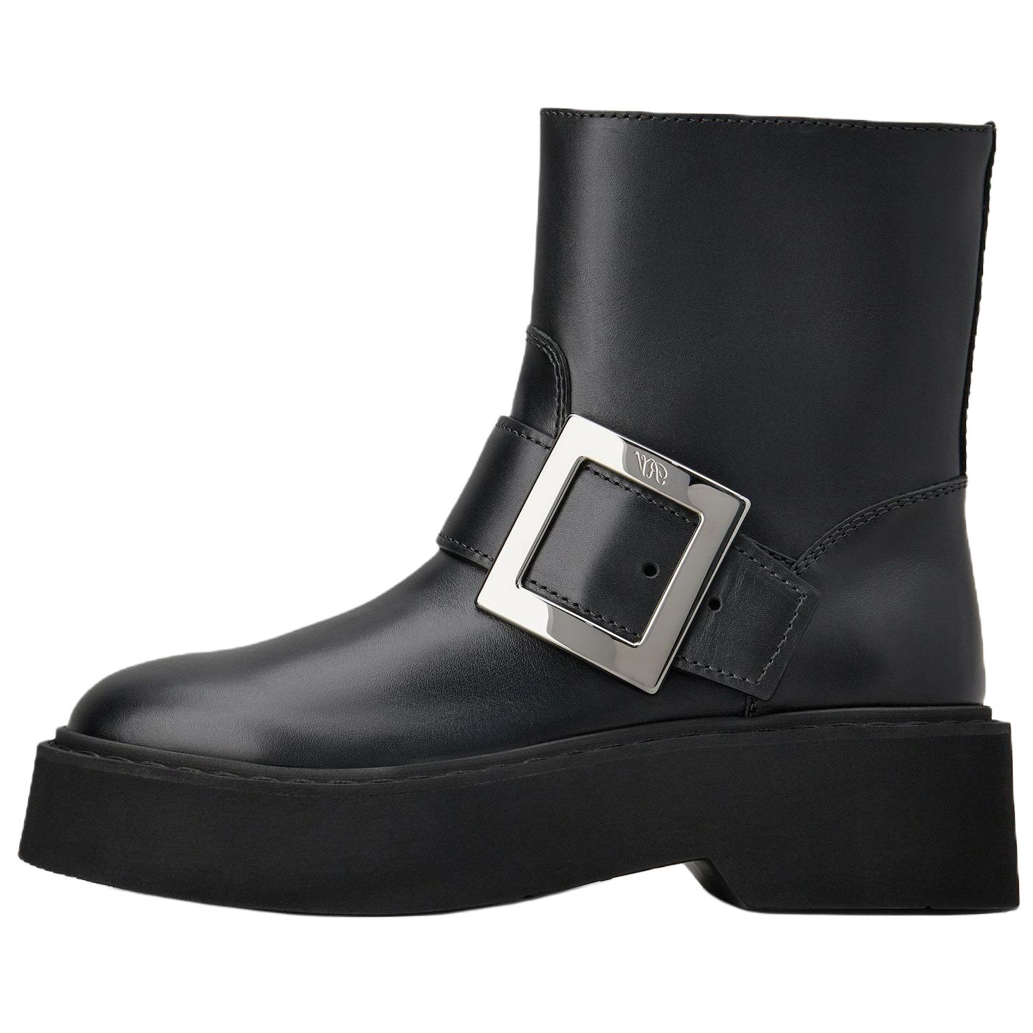 Roger Vivier罗杰维维亚 Viv' Rangers 小牛皮 圆头带扣 短靴 女款 黑色