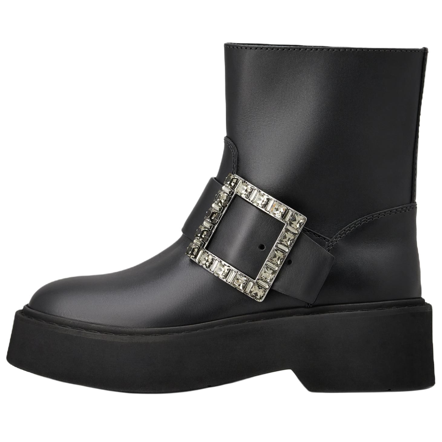 Roger Vivier罗杰维维亚 Viv' Rangers 小牛皮 圆头闪钻饰扣 短靴 女款 黑色