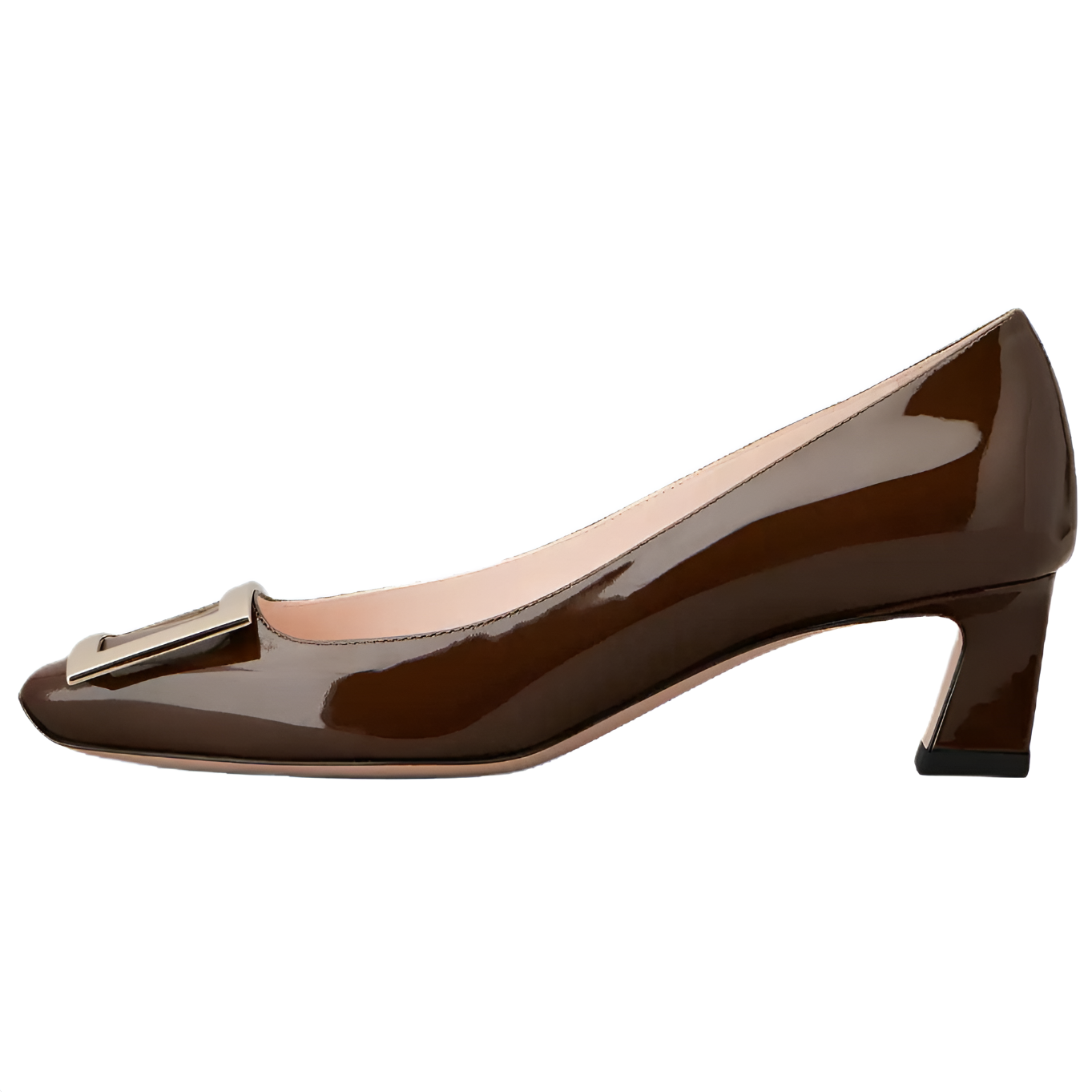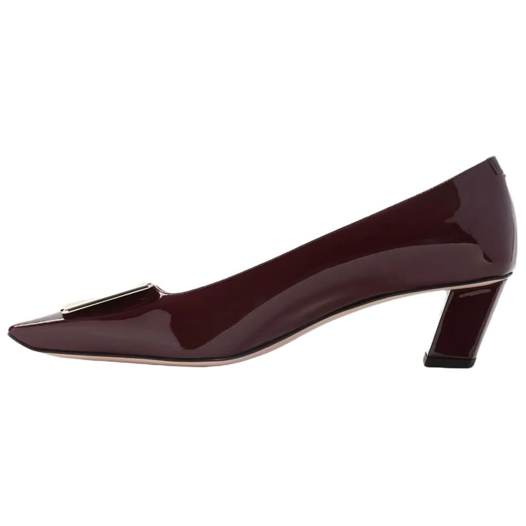 Roger Vivier罗杰维维亚 Trompette 漆皮 方头金属扣 异形跟 高跟鞋 7cm 女款 棕色