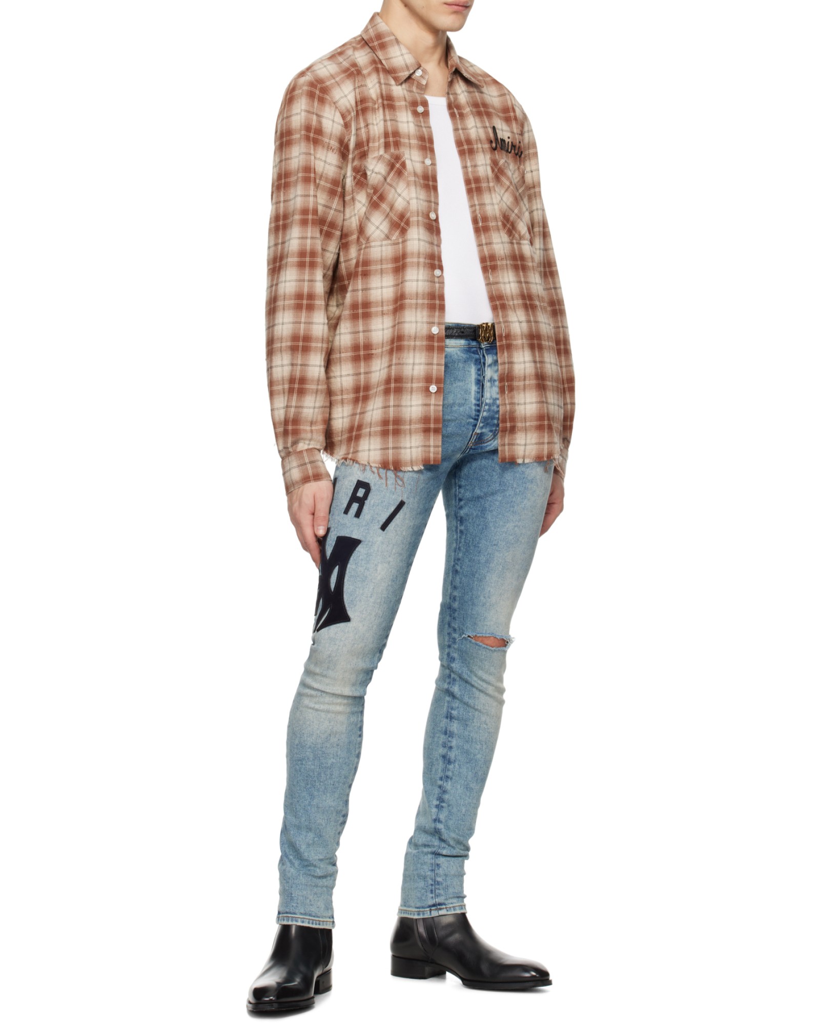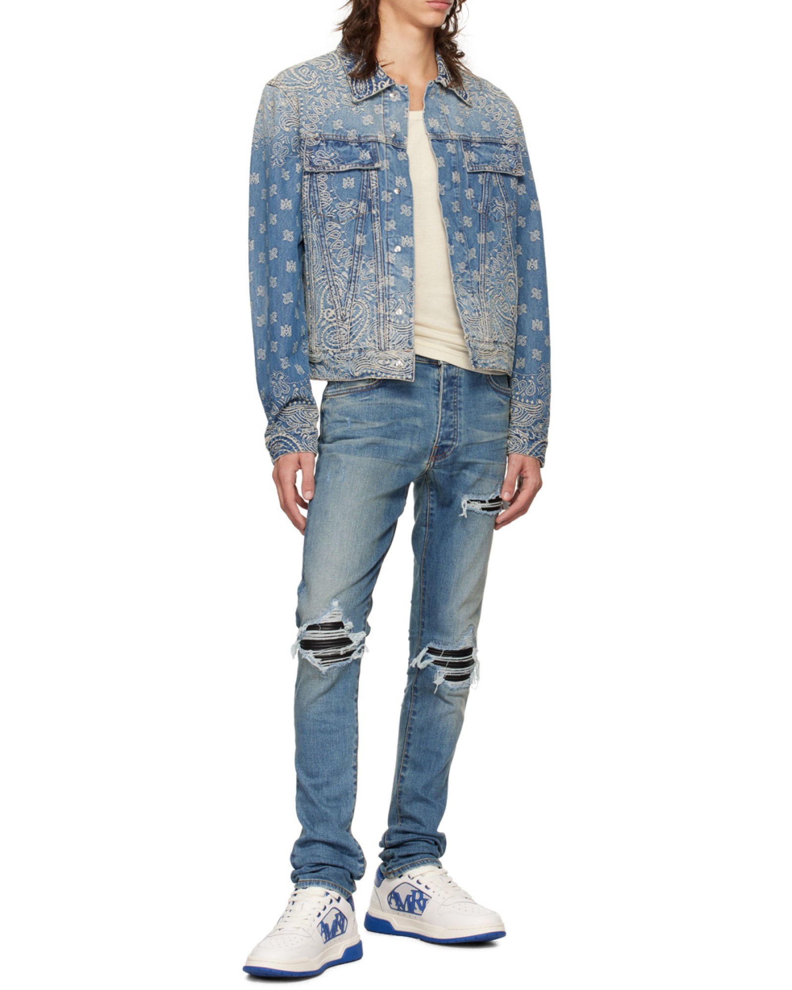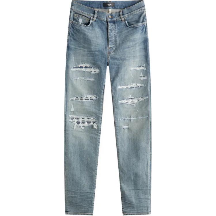 AMIRI 破洞徽标贴片纽扣修身牛仔裤 男款 蓝色