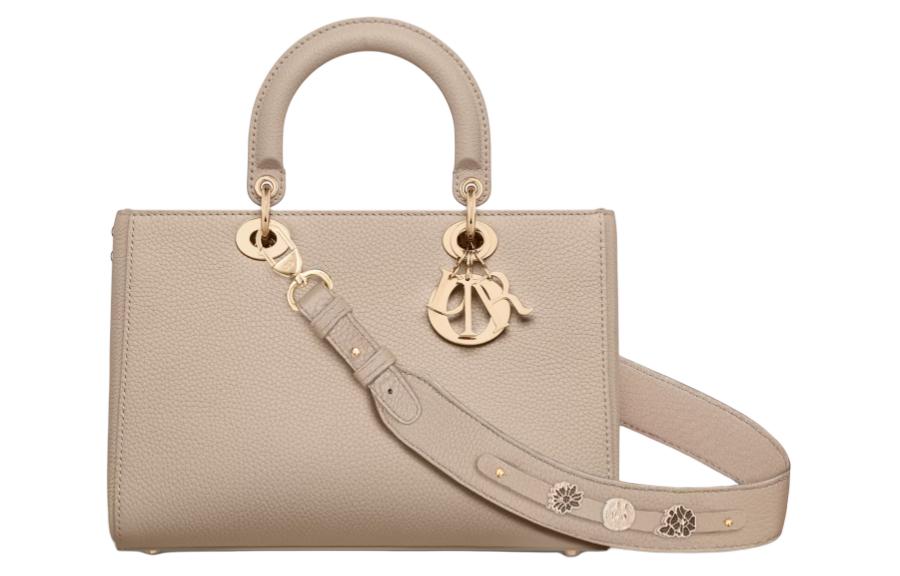 DIOR迪奥 Lady D-Sire My ABCDior 浅金色金属吊饰可调节肩带 牛皮革 戴妃包单肩斜挎手提包 中号 女款 胭脂米色