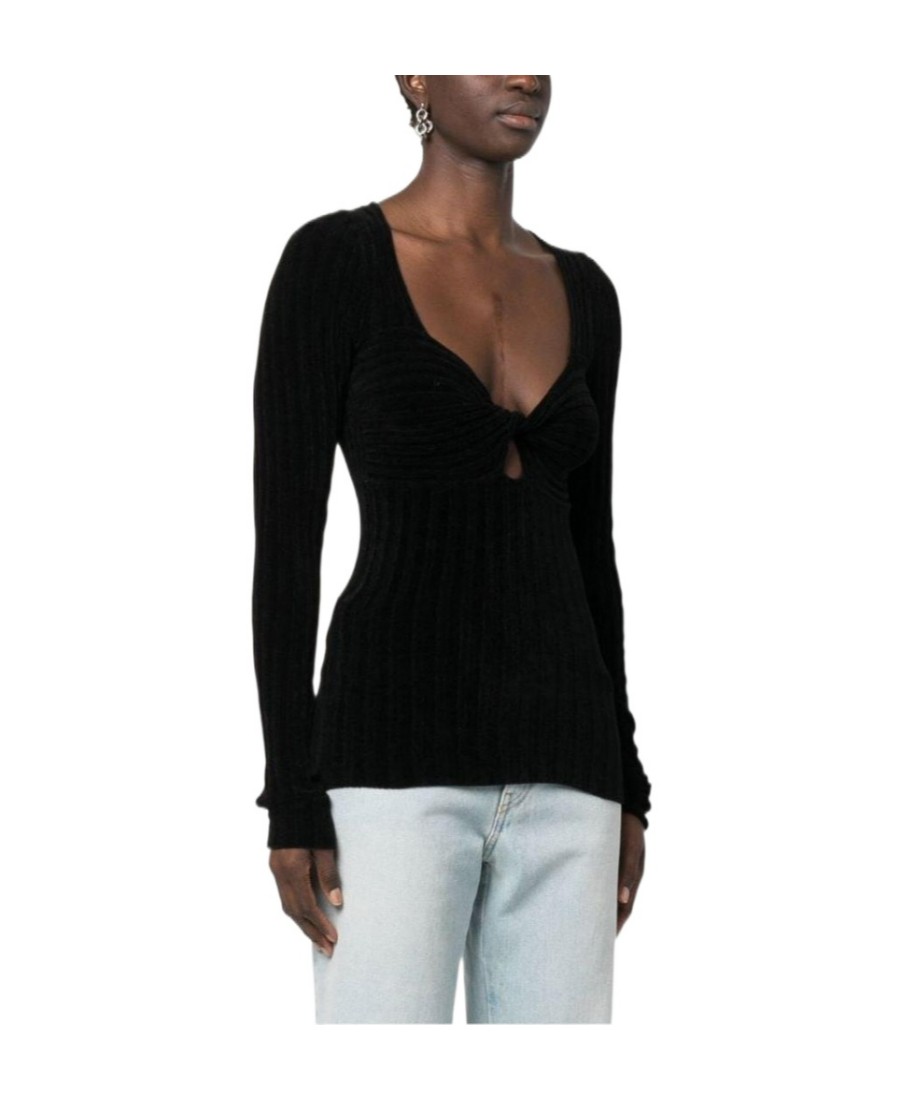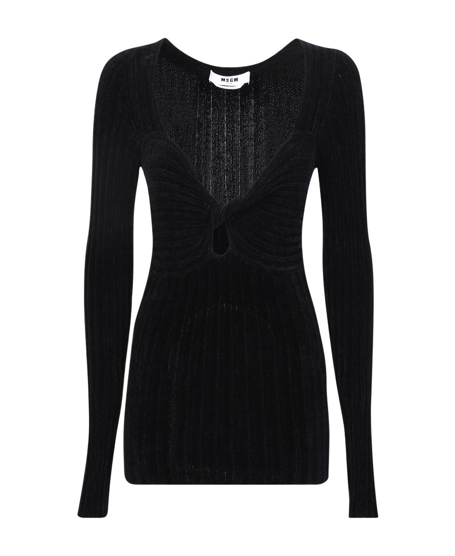MSGM FW22 纯色镂空旋褶罗纹长袖针织衫 女款 黑色