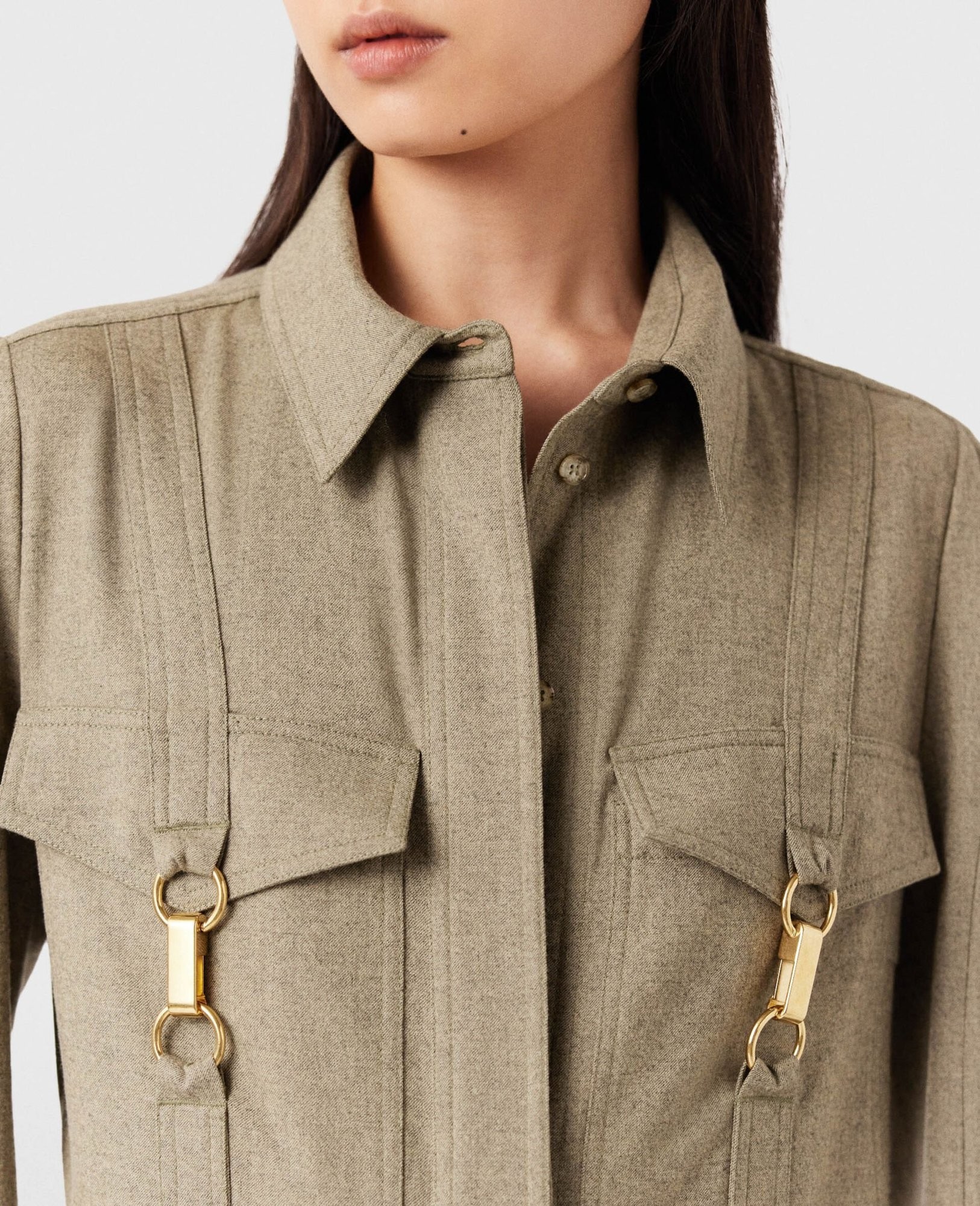 Stella McCartney SS24 纯色尖领单排扣长袖衬衫 女款 灰褐色