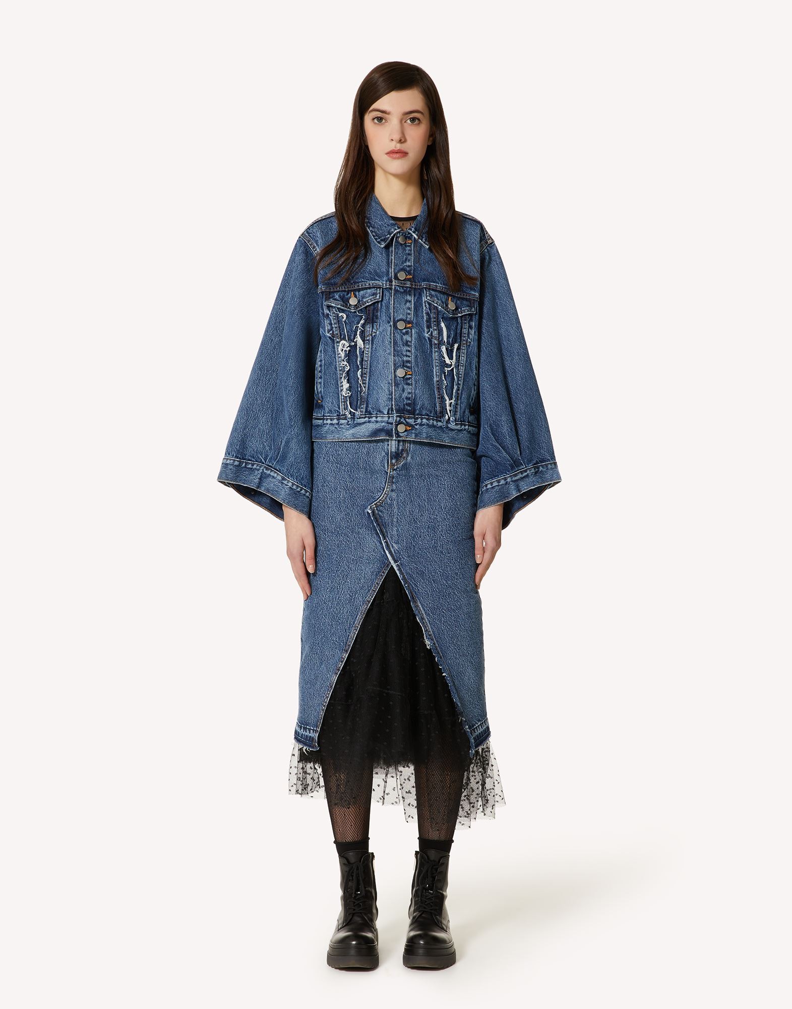 RED VALENTINO FW21 细网眼薄纱装饰A字半身长款牛仔短裙 女款