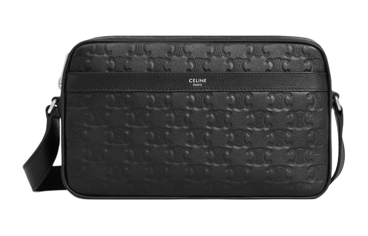 CELINE赛琳 Triomphe 银色饰面Logo徽标压花拉链开合 牛皮革 邮差包单肩斜挎包 中号 男款 黑色