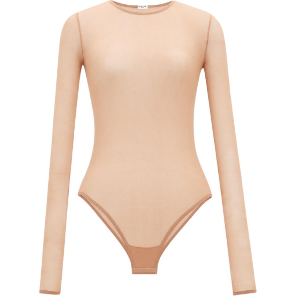 SAINT LAURENT圣罗兰 纯色圆领透明三角长袖连体衣 女款 杏色
