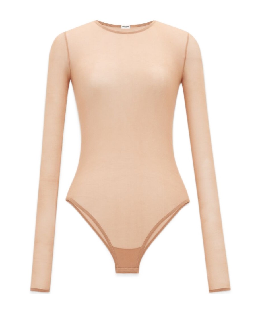 SAINT LAURENT圣罗兰 纯色圆领透明三角长袖连体衣 女款 杏色