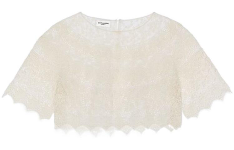 SAINT LAURENT圣罗兰 SS22 蕾丝细节短款圆领套头短袖衬衫 女款 米白色