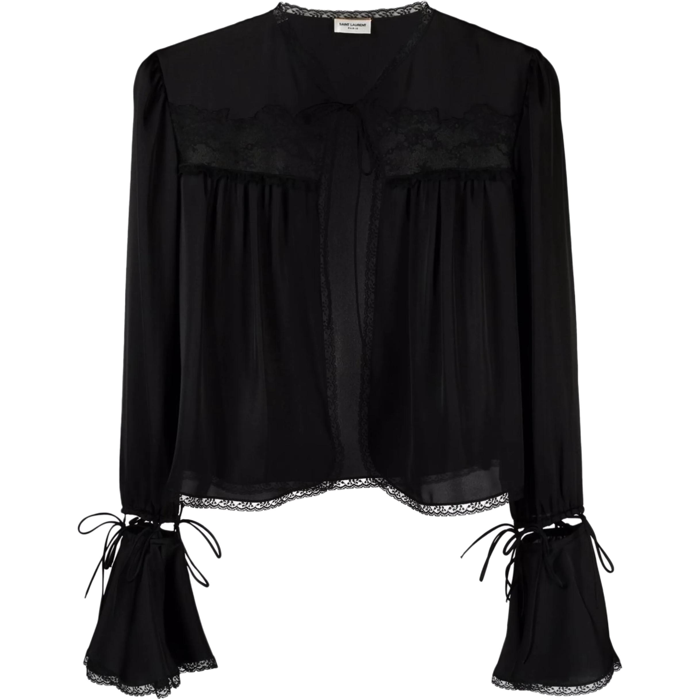 SAINT LAURENT SS21 纯色蕾丝喇叭长袖衬衫 女款 黑色