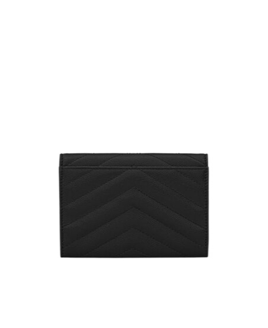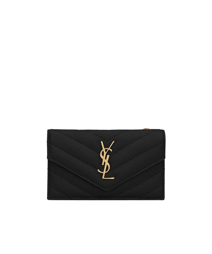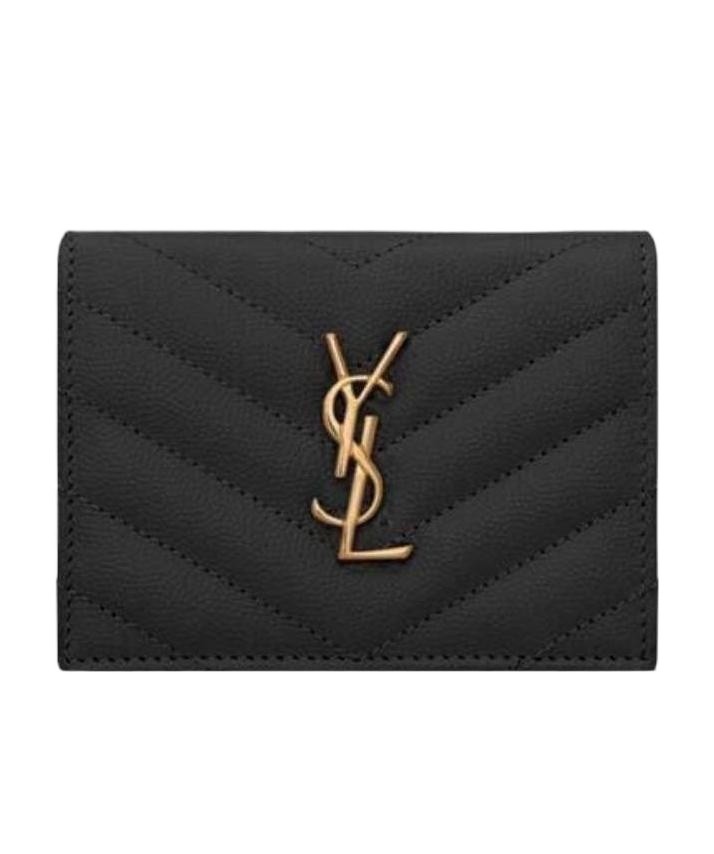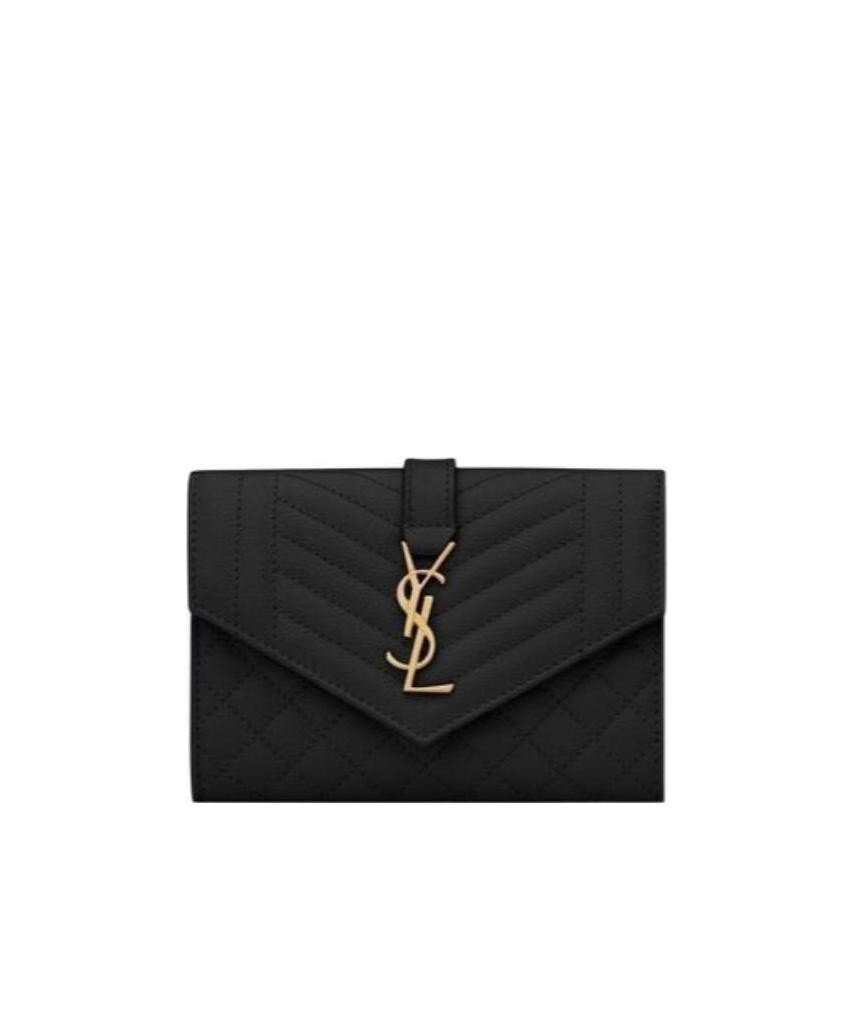 SAINT LAURENT圣罗兰 YSL CASSANDRE 金色调五金Logo绗缝面缝线迹短款翻盖 颗粒纹理压花牛皮革 信封包钱包 小号 女款 黑色