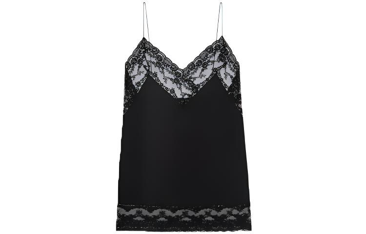 SAINT LAURENT SS21 半透明桑蚕丝缎面绉缎蕾丝短款吊带 女款 黑色