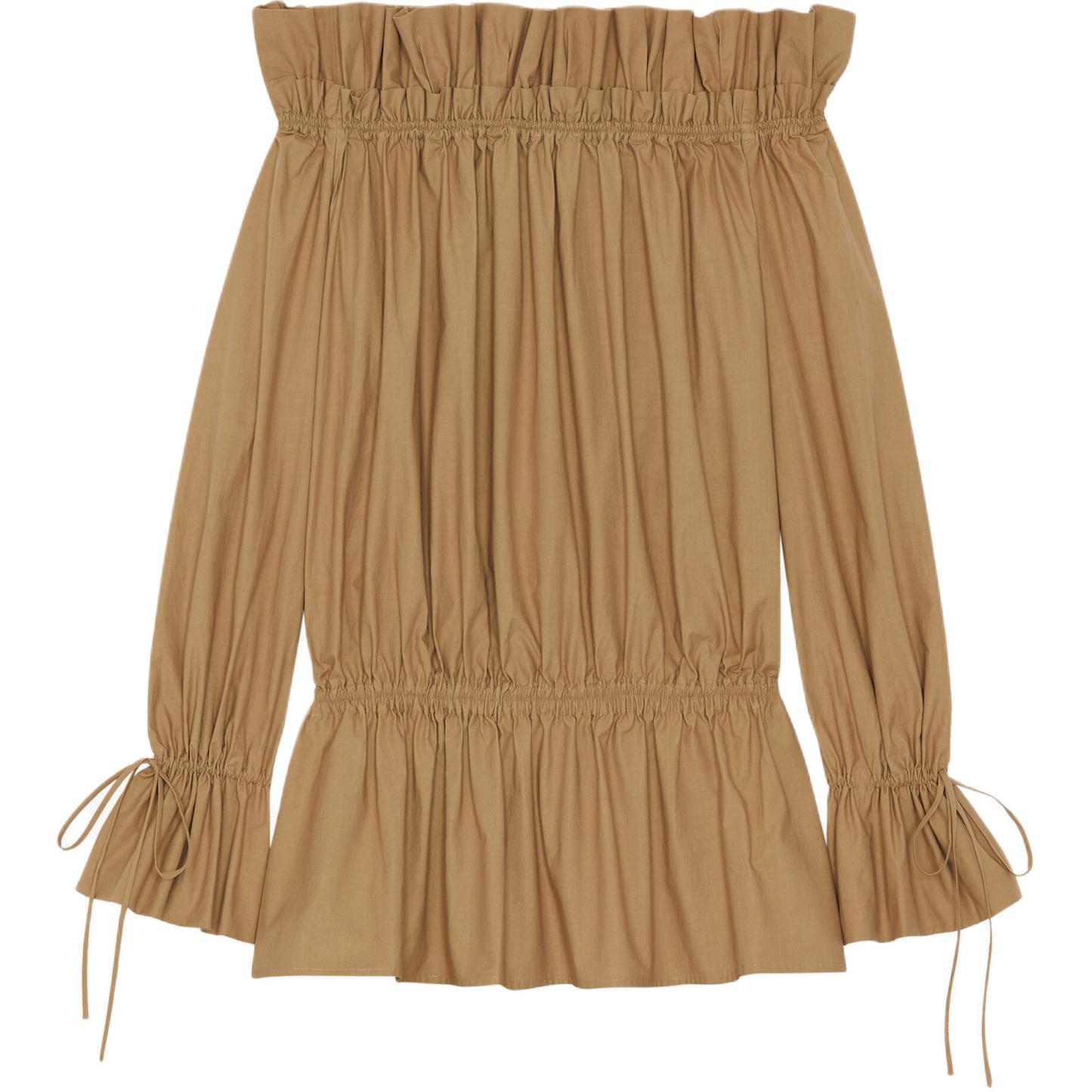 SAINT LAURENT圣罗兰 纯色褶皱露肩短款长袖连衣裙 女款 卡其色