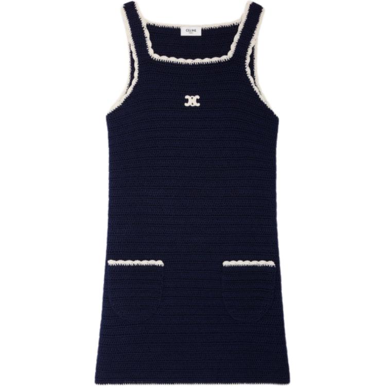 CELINE赛琳 SS25 钩针编织刺绣方领贴袋迷你无袖连衣裙 女款 海军蓝