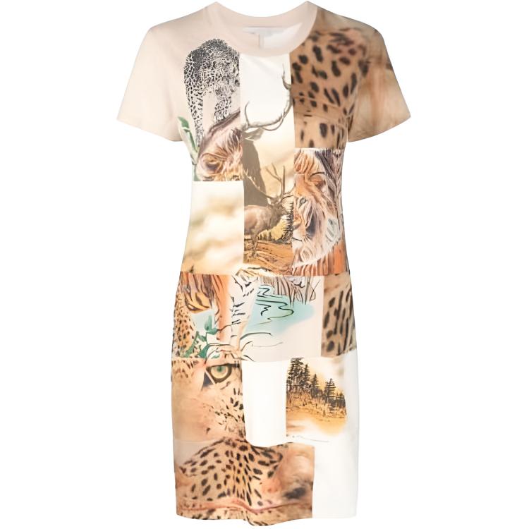 Stella McCartney SS23 动物印花拼接设计圆领T恤式短袖连衣裙 女款 棕色