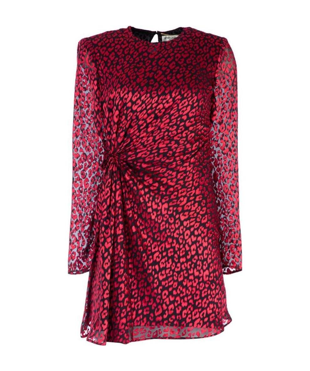 SAINT LAURENT圣罗兰 拼色豹纹褶皱圆领长袖连衣裙 女款