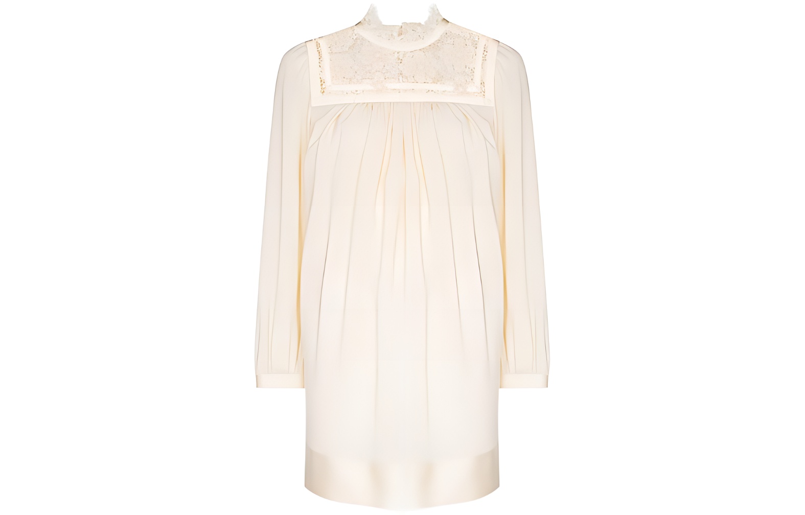 SAINT LAURENT圣罗兰 SS22 蕾丝印花拼接长袖连衣裙 女款 白色