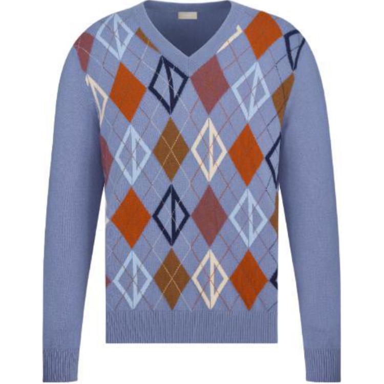 DIOR迪奥 SS24 菱形嵌花罗纹V领长袖针织衫 男款 蓝色